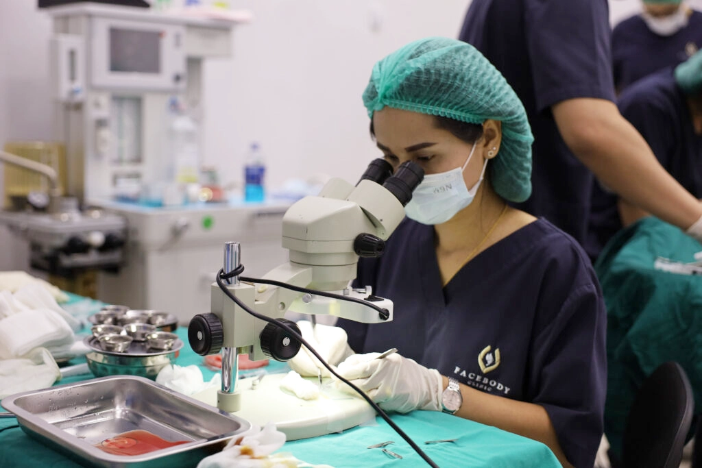 9. หลังจากทำการแช่รากผมในน้ำเลี้ยงเซลล์ แพทย์และทีมจะทำการแยกรากออกจากกัน ด้วยการส่องกล้องจุลทัศน์เพื่อเตรียม ปลูกผมถาวร ขั้นตอนนี้เป็นขั้นตอนที่ละเอียด ห้องหัตถการต้องปลอดเชื้อ และใช้ความปราณีตอย่างมาก