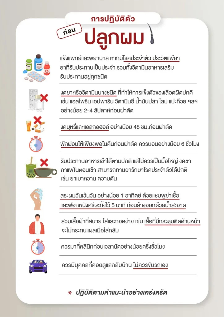 - หยุดทานวิตามิน ยา หรืออาหารเสริมบางชนิดที่ทำให้เลือดหยุดยาก ควรหยุดทานก่อนการ ปลูกผมถาวร ประมาณ 1-2 สัปดาห์