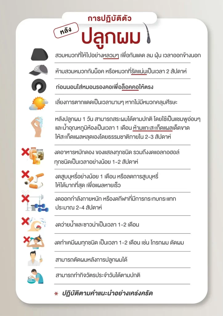 - งดออกกำลังกาย และยกของหนัก 1 สัปดาห์ งดอากาศร้อนจัด เช่น อบซาวน่า หรือ สตรีม 1 เดือน พยายามให้เหงื่อออกบริเวณศรีษะน้อยที่สุด