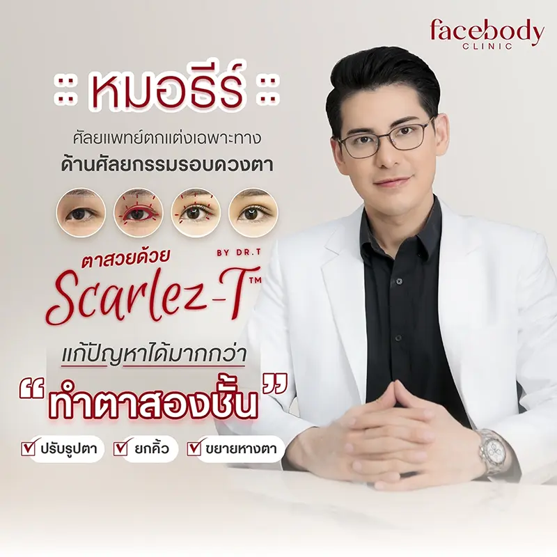 การทำศัลยกรรมตาสองชั้น Scarlez-T เป็นเทคนิคที่คุณหมอธีร์ (นพ.ธีร์ ว่องวุฒิกำจร) ทุ่มเทประสบการณ์ที่มีทั้งหมดเพื่อดีไซน์ให้ Scarlez-T เป็นเทคนิคศัลยกรรมตาสองชั้น ที่บวมช้ำน้อย พักฟื้นไว ที่สำคัญไร้รอยแผลเป็น เพราะเปิดแผลที่ชั้นตาแค่ 1 มิลลิเมตรเท่านั้น จึงสามารถใช้ชีวิตต่อได้ทันที ไม่ต้องลางาน ไม่ต้องพักฟื้นให้เสียเวลา อีกทั้งคุณหมอยังได้ฝึกฝนเทคนิคนี้มาแล้วกว่าพันเคส ทำให้เข้าใจปัญหาชั้นตาแบบทุกซอกทุกมุม เรียกได้ว่ามีปัญหาตาหนักแต่ไหนคุณหมอเอาอยู่! ถ้าถามว่าทำตาสองชั้นกี่วันหาย หากใช้เทคนิคนี้บอกคำเดียวเลยว่าแค่ 2-3 ก็หายบวมแล้ว
