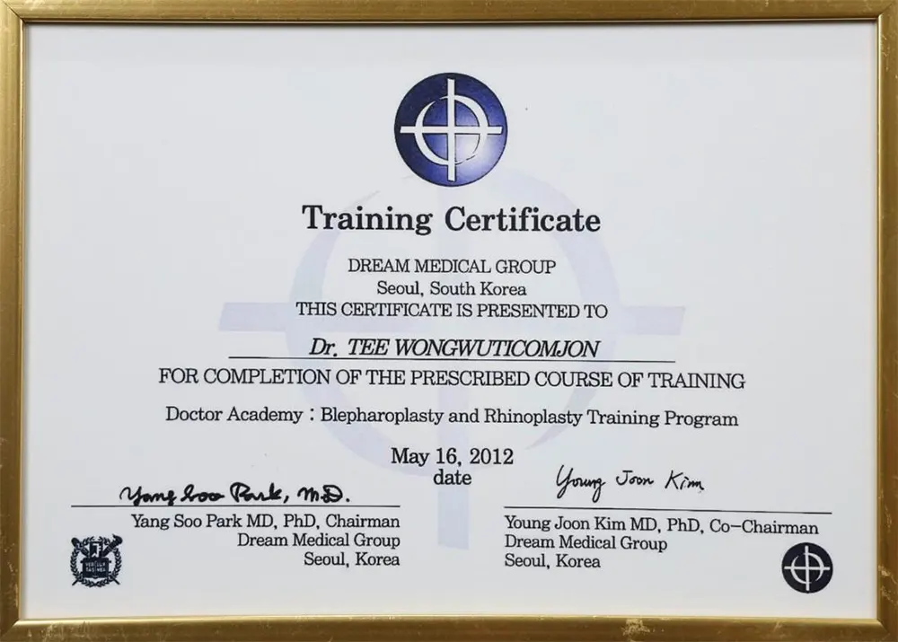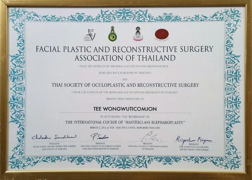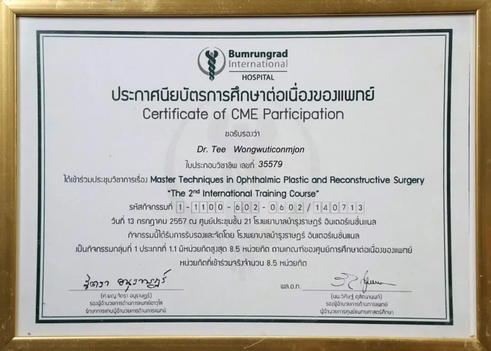 - วุฒิบัตรเฉพาะทางต่อยอด ศัลยกรรมจักษุตกแต่งและเสริมสร้าง โรงพยาบาลธรรมศาสตร์เฉลิมพระเกียรติ