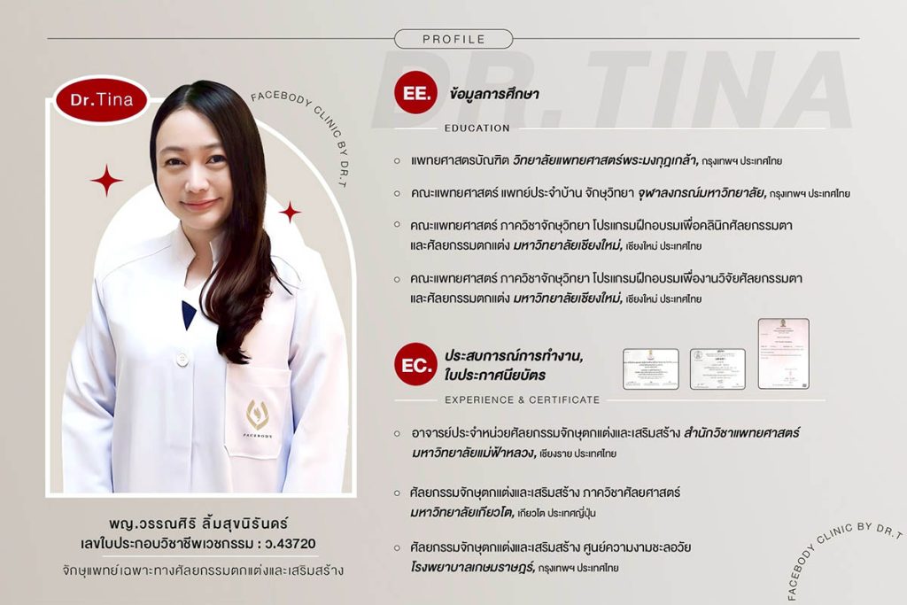 นพ.ธีร์ ว่องวุฒิกำจร แพทย์เฉพาะทางจักษุและศัลยกรรมความงาม มีประสบการณ์ด้านศัลยกรรมความงามมากว่า 10 ปี สิ่งสำคัญที่สุดในการทำศัลยกรรมความงามคือ การผสมผสานทั้งศาสตร์ และศิลป์ให้ลงตัวที่สุด เพื่อตอบโจทย์ปัญหาได้ทุกแบบ คุณหมอได้นำความรู้ทางการแพทย์ที่เล่าเรียนมาผนวกกับการดูงานหลายแห่งในต่างประเทศและประสบการณ์การผ่าตัดหลากหลายเคส มาผสมผสานกับมุมมองทางด้านศิลปะเพื่อทำให้ผลงานออกมาดีที่สุด และรับกับใบหน้าของลูกค้า เข้ากับบุคลิกลักษณะของแต่ละคน และให้ดูเป็นธรรมชาติมากที่สุด ซึ่งผลสรุปก็คือความพึงพอใจของทั้งตัวคุณหมอเองและลูกค้า