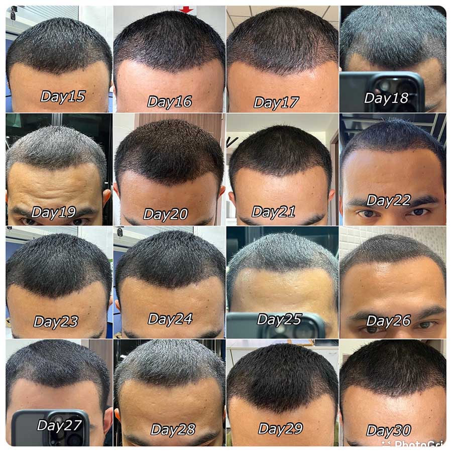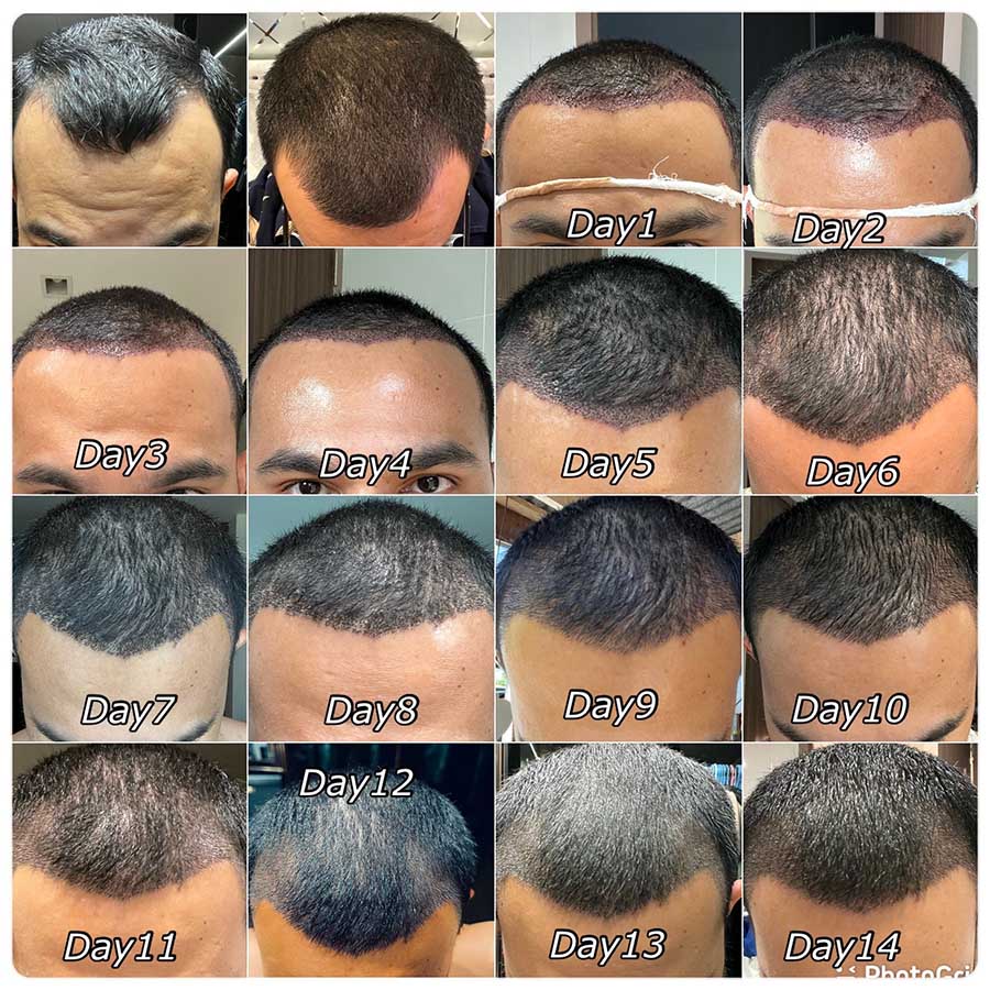 ปลูกผม 14 วัน ช่วงนี้ เซลล์รากผมเริ่มติด จะเริ่มเห็นความยาวของเส้นผมประมาณ 2-3 มิล อาจมีสเก็ดแผลอยู่บ้างในช่วง 2 สัปดาห์แรก เป็นช่วงที่เห็นแนวไรผมและกรอบหน้าได้ชัด เส้นผมที่ปลูกเริ่มค่อยๆ โตขึ้นหลังจากที่ปลูกไปวันแรก ช่วงนี้สระผมต้องเบามือและพยามให้เหงื่อออกน้อยที่สุด เพื่อผลลัพธ์ที่ดี