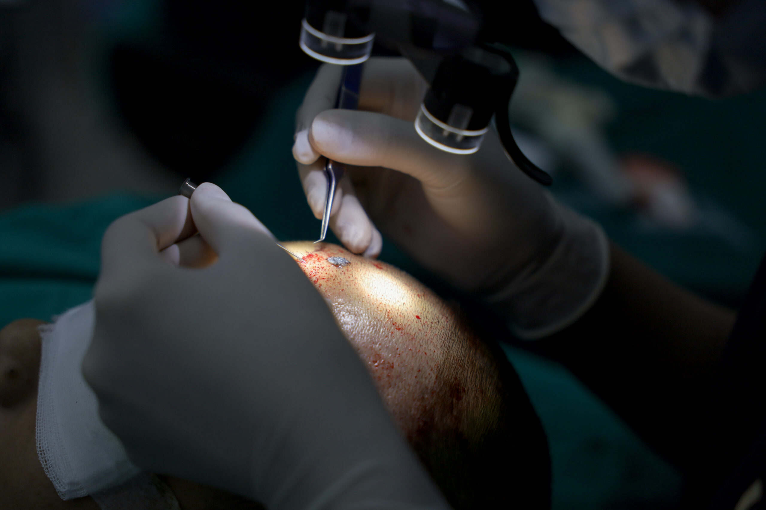 - แพทย์ทำการฉีดยาชา และใช้เครื่องมือที่เป็นหัวเจาะ ขนาดประมาณ 0.8-1.2 มม. เจาะเลือกเซลล์รากผมที่แข็งแรงออกมา