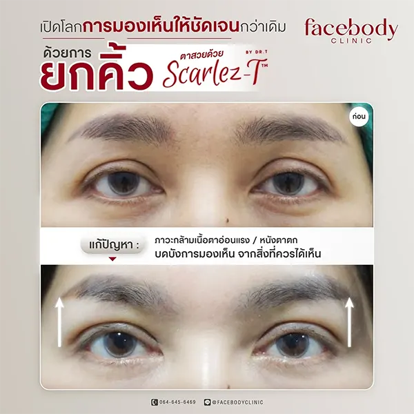 - ผลลัพธ์ที่ยาวนาน: การยกคิ้วสามารถช่วยลดรอยย่นและริ้วรอยรอบดวงตา ทำให้ใบหน้าดูสดใสและอ่อนเยาว์