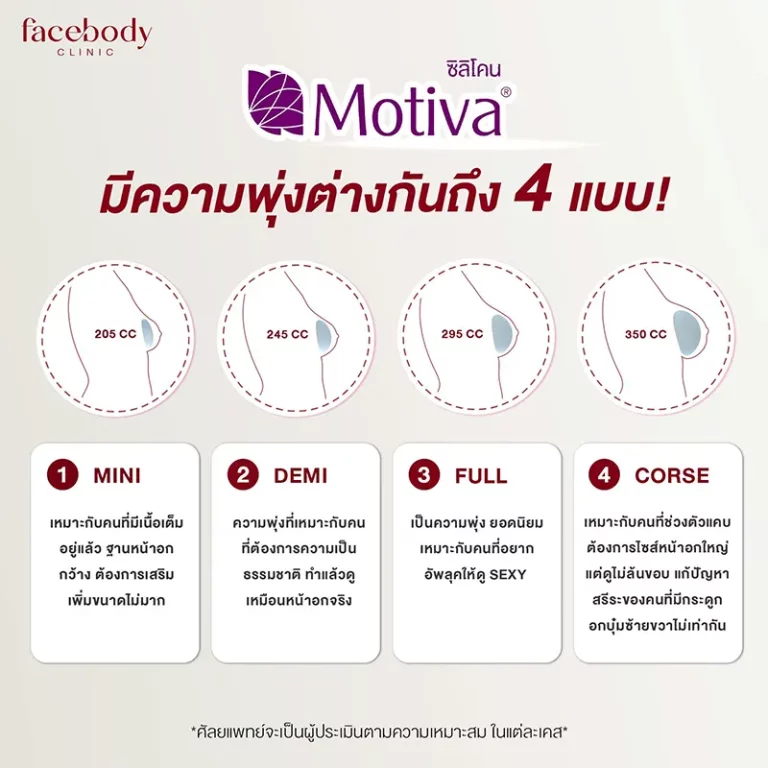 เป็นยี่ห้อที่มีความปลอดภัยสูง Motiva รุ่นที่นิยมมีหลายรุ่น เช่น Implants รุ่นนี้เป็นซิลิโคนผิวนาโนกำมะหยี่ยืดหยุ่นดี รองรับแรงดึงได้ถึง 270%, รุ่น Silk Surface Plus มีความดึงดูดสายตาเหมือนหน้าอกสาววัยรุ่น, รุ่น Ergonomix มีความพิเศษที่ตัวชิพเก็บข้อมูลการผ่าตัดเพื่อให้สามารถสืบค้นประวัติการผ่าตัดทำ ศัลยกรรมหน้าอก ในกรณีที่จำเป็นต้องใช้ข้อมูลนี้ในอนาคต