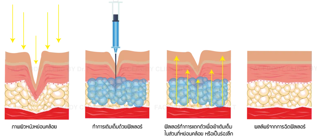 การฉีด ฟิลเลอร์ เพื่อ ลดเลือนริ้วรอย ร่องลึกบนใบหน้า ด้วยการฉีด filler ฟิลเลอร์ เข้าไปเติมเต็มในชั้นผิวที่เริ่มเสื่อมสภาพ ด้วยคุณสมบัติอุ้มน้ำของฟิลเลอร์ จะช่วยเพิ่มความชุ่มชื้น ทำให้ผิวเปล่งปลั่ง และชะลอการเกิดริ้วรอยในอนาคตได้ เมื่ออายุมากขึ้น มีการยุบตัวลงของชั้นผิวหนัง filler ฟิลเลอร์ จะทำให้ผิวหน้ากลับมาเรียบเนียน เต่งตึง ใบหน้าแลดูอ่อนวัย
