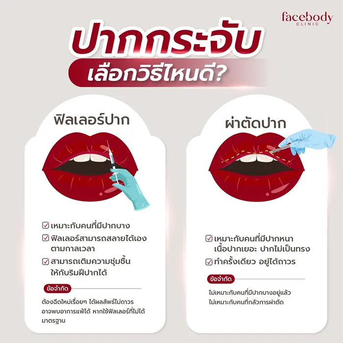 - ปรับรูปทรงของริมฝีปาก: ช่วยแก้ไขปัญหาปากบน-ล่างไม่เท่ากัน ปากบางเกินไป หรือปากหนาเกินไป ทำให้ริมฝีปากดูสมดุลกับใบหน้ามากขึ้น
