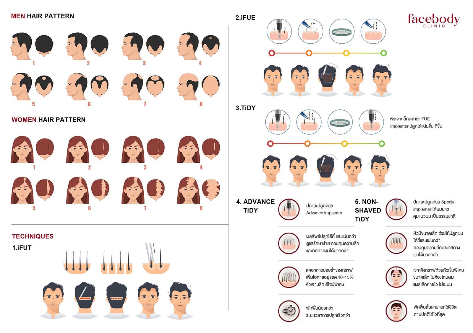 - Facebody Clinic ใช้เทคนิคที่ทันสมัย เช่น FUE (Follicular Unit Extraction) ซึ่งเป็นการปลูกผมแบบไม่ต้องใช้การผ่าตัดเหมือน FUE แผลค่อนข้างเล็ก