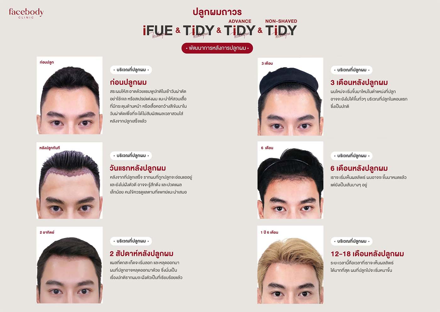 - Facebody Clinic ให้ความสำคัญกับการดูแลหลังการปลูกผม โดยจะมีการติดตามผลอย่างต่อเนื่องและมีคำแนะนำในการดูแลรักษาผมอย่างเหมาะสม