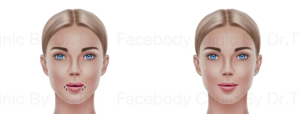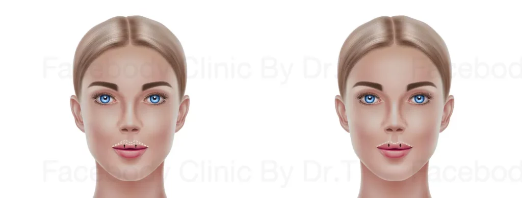 การทำศัลยกรรมยกริมฝีปาก ริมฝีปากบนจะต้องยกเห็นฟันบนเล็กน้อย ในกรณีที่ริมฝีปากบนที่ตกลงมาปิดฟันบนจนหมด เวลายิ้ม หรือเวลาพูดจะไม่เห็นฟันบน และเห็นแต่ฟันล่างทำให้สัดส่วนระหว่างปลายจมูกและปากบนยาวเกินไป ทำให้ยิ้มไม่สวย การศัลยกรรมยกริมฝีปากบน การทำให้ระยะระหว่างปลายจมูกและริมฝีปากบนสั้นลง มี 2 วิธี
