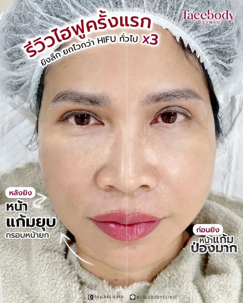 - Hifu / V-lift บริเวณร่องแก้ม ร่องน้ำหมาก ดูตื้นขึ้นไม่เป็นร่องลึก